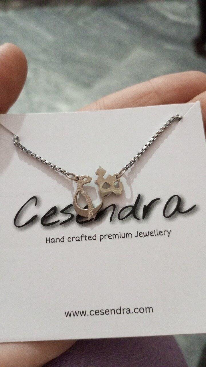 An Arabic Initial Pendant with double initials is a stylish piece of jewelry that features two Arabic letters, usually representing the initials of a person or a significant other. The letters are often elegantly intertwined or placed side by side, crafted from precious metals like gold or silver. The pendant may also be adorned with gemstones or intricate designs, making it a unique and personalized accessory that holds deep cultural and personal significance.